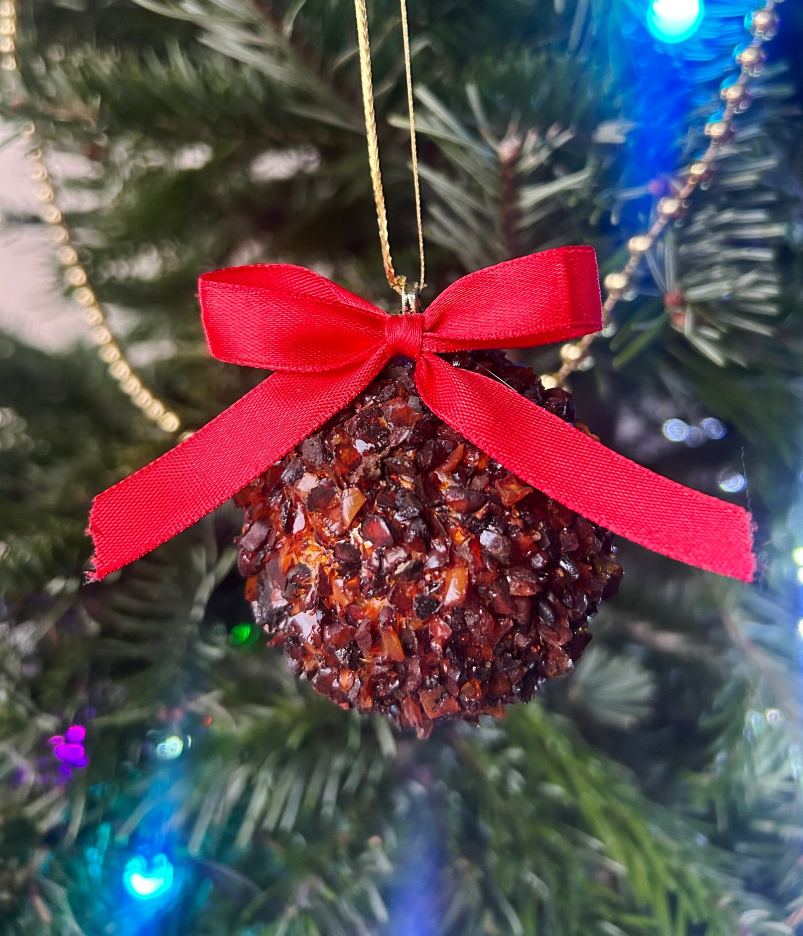 Kalėdiniai gintaro žaisliukai su raudonu satino kaspinu. Pakabinus žaisliukus ant eglutės atrodai labai organiškai, natūraliai ir iškilmingai.