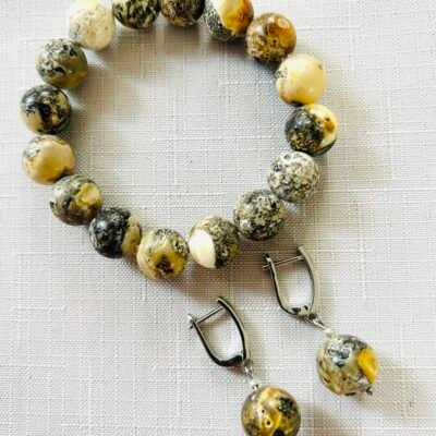 Tamsiai žaliojo ir masyvaus gintaro komplektas – auskarai ir pakabukas. Tai itin elegantiškas ir grakštus spalvų derinys viename komplekte.