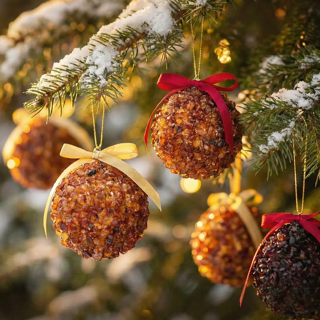 Kalėdiniai gintaro žaisliukai su raudonu satino kaspinu. Pakabinus žaisliukus ant eglutės atrodai labai organiškai, natūraliai ir iškilmingai.