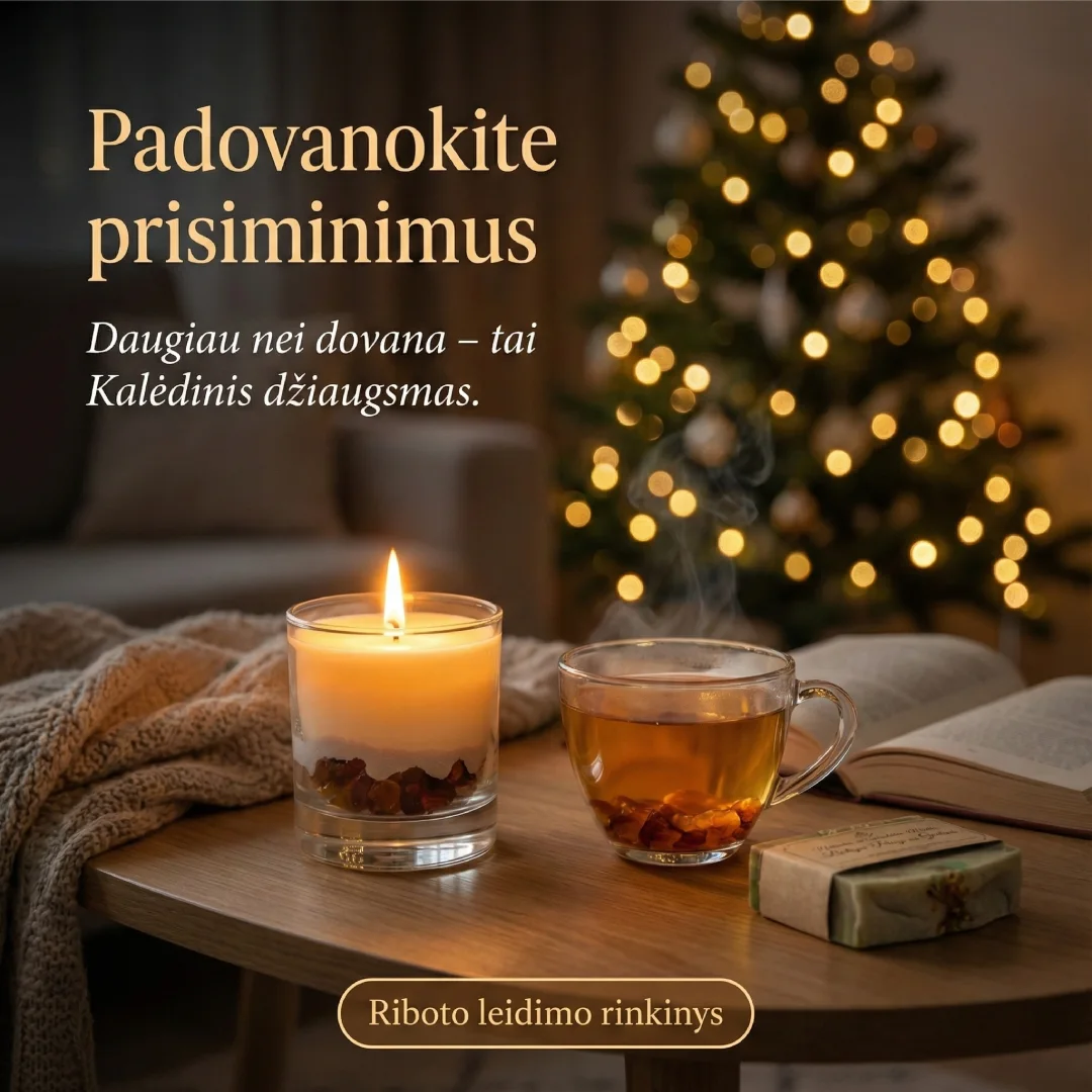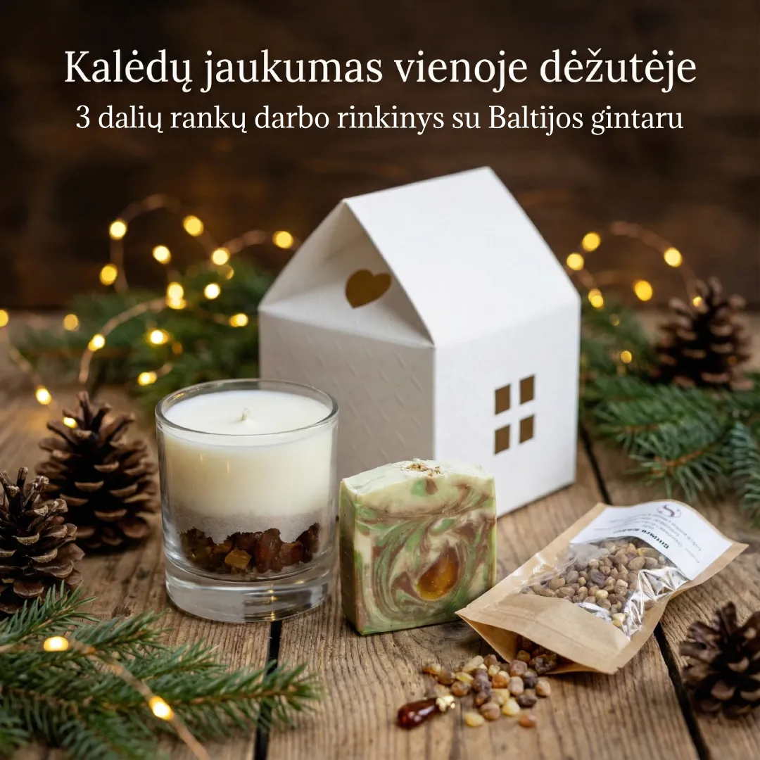 Sojų žvakė su natūralios kilmės aliejais ir gintaro gabalėliais. Tai šiltas, švelnus ir lengvas kvapas jūsų namams.