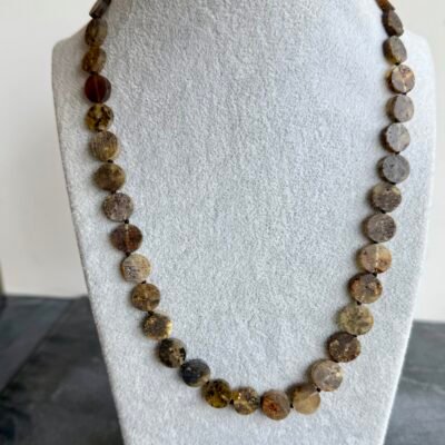 Geltonas lyg saulės spalva žėrintis gintaro vėrinys spinduliuojantis elegancija ir estetika.
