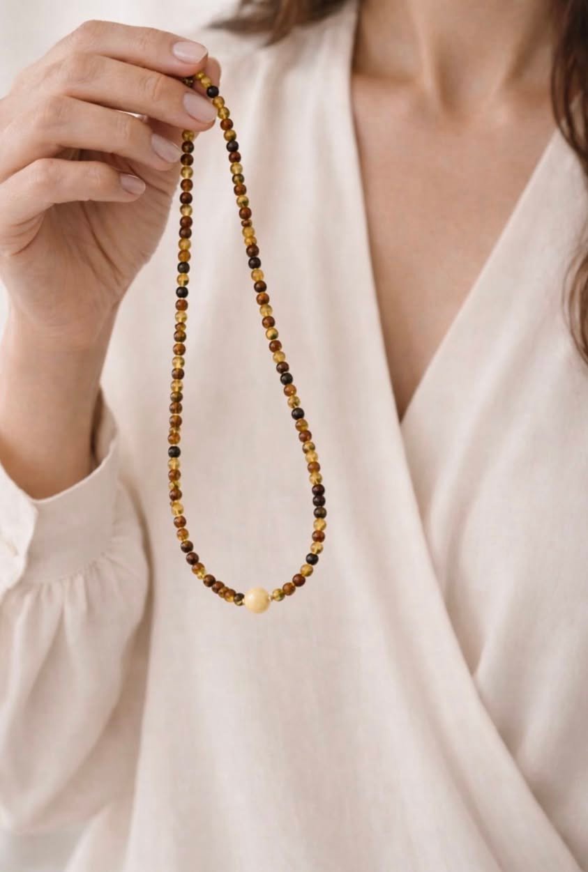 Išskirtinumas: kiekvienas karoliukas unikalus, su natūraliu gintaro raštu ir tekstūra